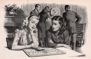 Commentary: ‘Two Girls Playing With a Ouija Board’. The ‘Girls’ are curious to see what will happen if they contact spirits on the “other side”. Indeed, it is said that it was ‘Two Girls’ who popularized the Ouija Board in 1848. They were sisters from Hydesville, New York. They became instant celebrities and sparked a national obsession that spread all across the United States and Europe, signaling the birth of modern spiritualism.