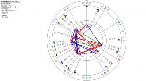 July 2021’s full Moon occurs on the 23rd in the US and the 24th in Australia. This is a rather ‘explosive’ full Moon, as I imagine that you can see from the Sabian Symbols for the planets. It’s also a time of strong retrograde energies: All of the outer planets are retrograde, including Chiron, with Uranus stationary and about to get retrograde on the ‘weathering the storm’ degree. So, we may feel frustrated and rather confused by events going on and may not see a clear way forward to our objectives. This is a time of pausing and contemplating your possibilities and desired outcomes, and, with the right mindset, you can have solutions and help arriving – sometimes seemingly out of nowhere (Venus on Virgo 3: TWO GUARDIAN ANGELS BRINGING PROTECTION).
