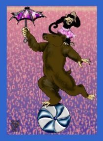 Keywords: Developing skills. Making excuses. Performing rote responses. Expecting others to perform. Entertaining people. Being theatrical. Stomach rubs. Big, tall, brute energies. Sitting down or standing up. Fur and fuzzy hair. Playing instruments. Dancing. Performances. Arm waving. Animal training. Bears. Training. Learning by example. Fun vs. drudge.
